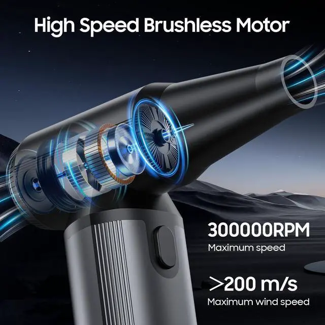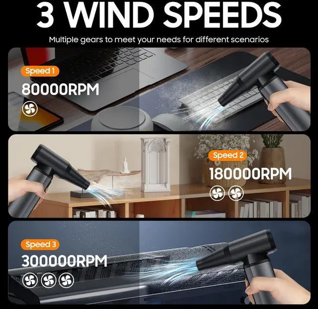 Powerful Turbo Fan: VOSFEEL electric air duster can reach a maximum speed of 300,000 RPM, efficiently removing dust. The air duster is equipped with 3 adjustable speed modes to meet various cleaning needs.