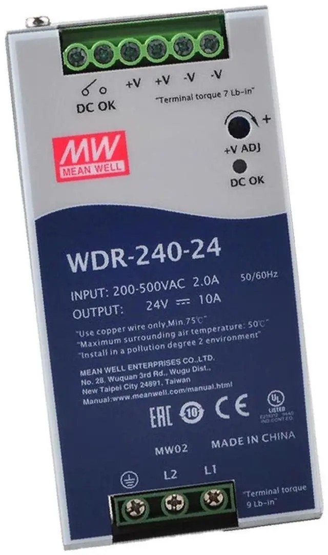 The WDR-240-24 is a high-performance 240W single output DIN rail power supply designed to meet the rigorous demands of industrial applications. Delivering a stable 24V DC output at 10A, this power supply boasts a wide input voltage range (180-550VAC) and an impressive 91% efficiency rating. The WDR-240-24 incorporates a built-in DC OK signal for convenient power status monitoring and offers adjustable output voltage for enhanced system flexibility. Built with safety and reliability in mind, it features comprehensive protection against short circuits, overloads, overvoltage, and overtemperature, and it meets UL508, EAC TP TC 004, and CB safety standards.