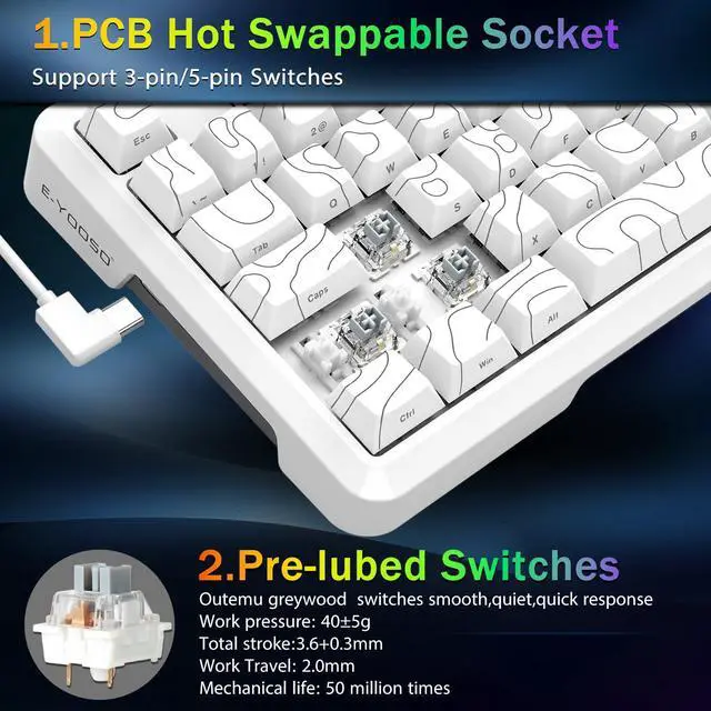 E-YOOSO 75% Wired Mechanical Gaming Keyboard, Creamy Sound, RGB Backlit, Hot Swappable Pre-lubed Linear Switches, Gasket Structure, Knob Control, Portable Compact Custom for PC, White