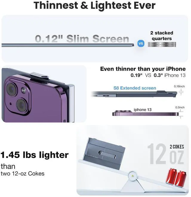 [2025 Upgraded: Ultra-Thin & Lightweight! ]This Laptop screen extender is just 0.24-inch thick thinner than your phone! Weighing only 1.45 lbs, it's a massive 30% lighter than before lighter than two 12-oz Coke cans! This feather-light, ultra-slim design fits effortlessly into the included carrying case. Instantly boost productivity with extra display real estate anywhere.