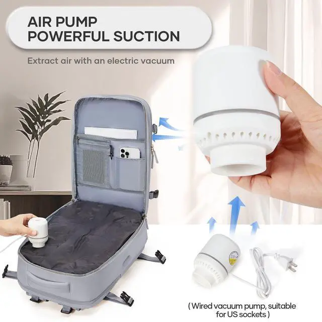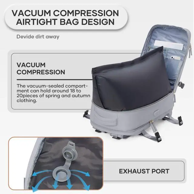The most unique feature of the vacuum bag equipped inside this travel backpack is that we use a double zipper design without zipper heads, which not only avoids the possibility of air leakage caused by loose zipper heads, but also avoids the possibility of the vacuum bag being forced to be invalidated after the zipper heads break. You just need to use the zipper clip and slide it back and forth a few times to ensure that the zipper is fully closed.