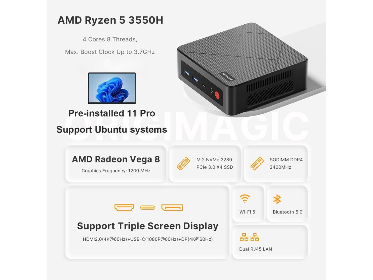 origimagic C4 Mini PC 11 Pro, Ryzen 5 3550H Mini Desktop Computer (Beat N150/N100/N95) Dual 1000Mbps NIC LAN, 16GB RAM 512GB SSD Micro PC, WiFi 5, BT 5.0, Triple Display, PC for Home Theater, Office