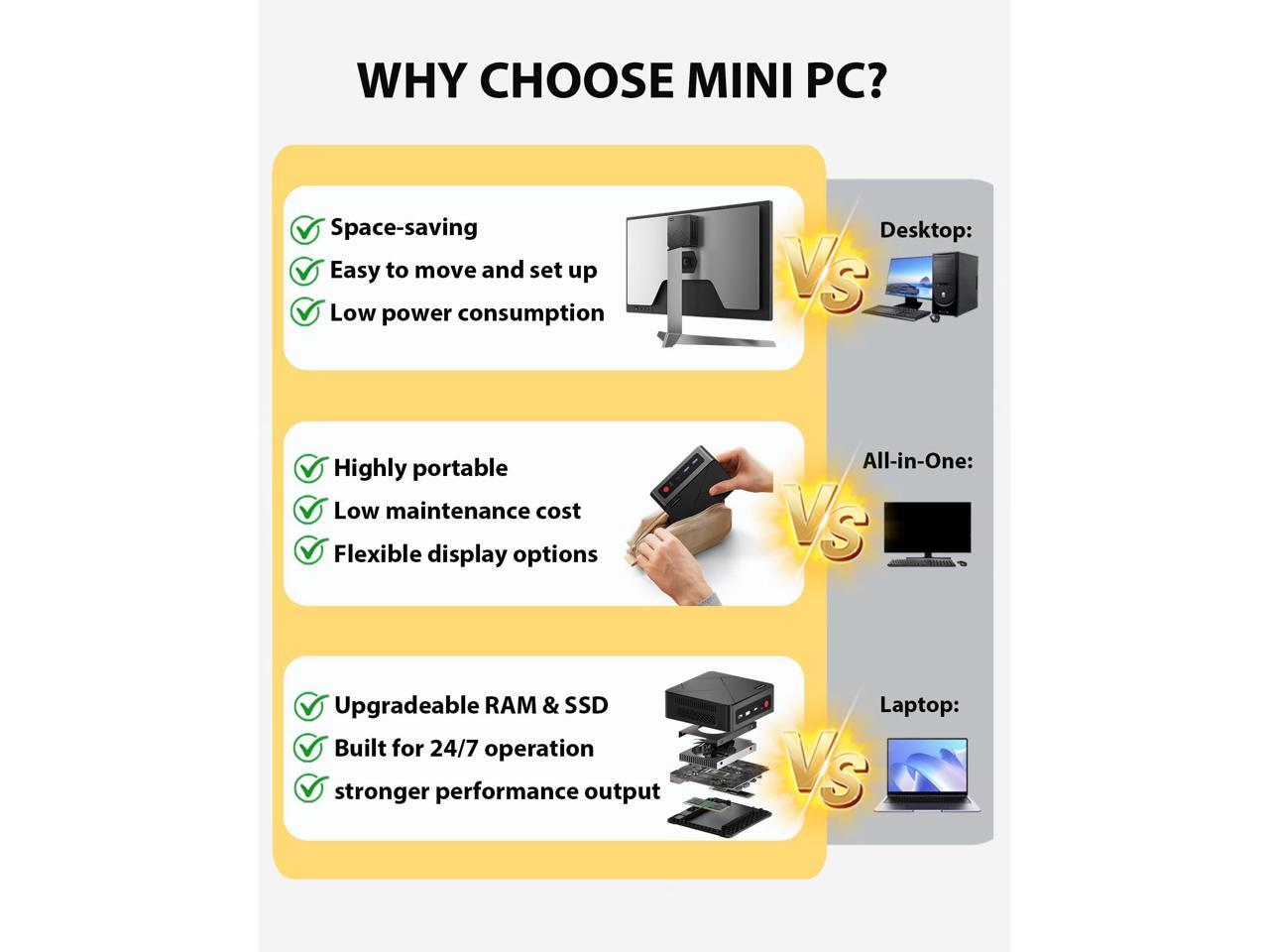 - WHY CHOOSE MINI PCThis mini PC packs desktop-level performance into a sleek, portable design. Perfect for home offices, streaming, or business. Its energy-efficient, quiet, and reliable 24/7all in a footprint that fits anywhere. Upgrade RAM and SSD easily as your needs grow. Multiple display outputs and plug-and-play functionality mean you can say goodbye to bulky tower designs: get better performance, less clutter, and big savings on space and power. The smart, modern pick over traditional desktops and laptops.