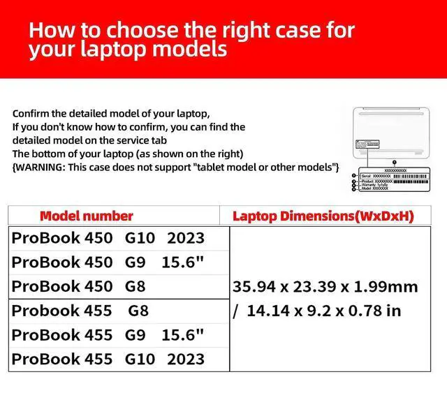Protective cover for HP ProBook 450 G8 G9 G10 / 455G8 G9 G10 15.6" 2023 PU leather inner pocket cover only. The case size is: 14.09X9.25X0.78 inches. Please check your model number for purchase. It does not work with other 15.6-inch machines. Don't mind buying at will. You can contact us to recommend a protective case for your machine. Thank you.