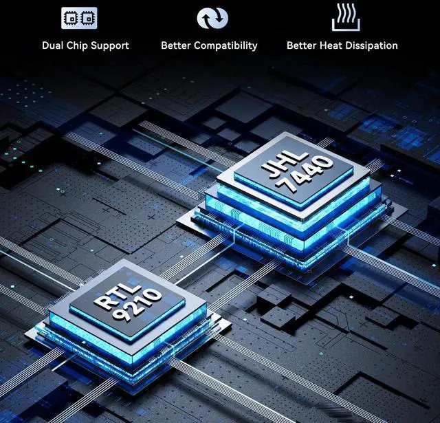 Advanced Dual Chip DesignFeaturing the high-performance JHL7440 + RTL9210 chipset combination, this M.2 enclosure ensures seamless compatibility with USB4/USB 3.2/3.1/3.0/2.0 interfaces. It delivers broad compatibility across laptops, desktops, and tablets, ensuring stable connectivity in diverse usage scenarios.