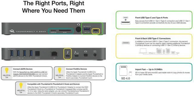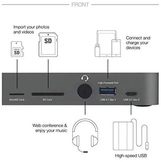 Features 14 Ports of connectivity: USB 3.1 Gen 2 / Gen 1 + Thunderbolt 3 + microSD Reader + SD Reader + mini DisplayPort + Gigabit Ethernet + S/PDIF + Combo Audio I/O.