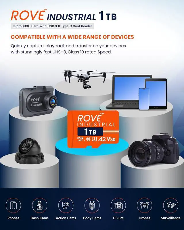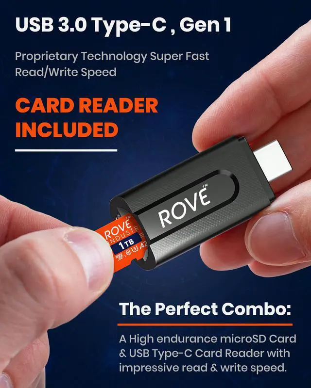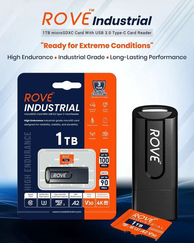 CARD READER INCLUDED: The ROVE Industrial 1TB microSD card comes with high-speed proprietary technology USB 3.0 Type C card reader.
