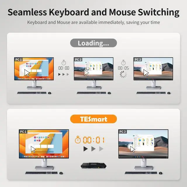 HDMI KVM Switch 2 IN 1 OUT: HDMI KVM switch is perfect for hooking up 2 desktops or laptops to share 1 set of keyboard, mouse and 1 monitor for home and office setup, gaming consoles and streaming devices. Experience the convenience and efficiency of multi-device management
