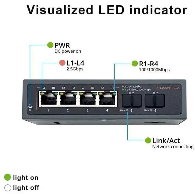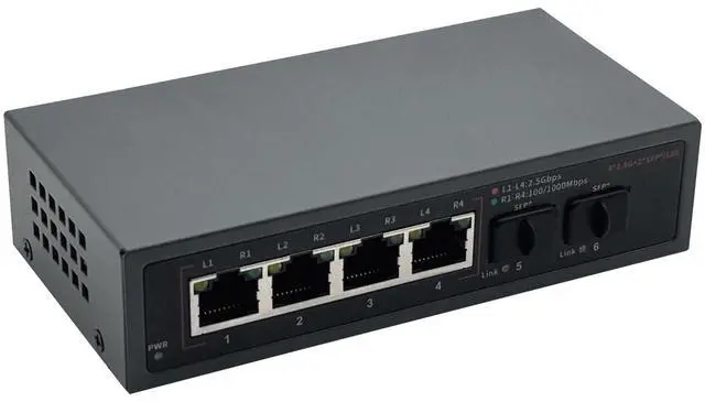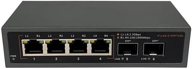 6 Ports 2.5G Ethernet SwitchThe 2.5G switch has 4 x 2.5G ethernet ports and 2 x 10G SFP ports. Ports 1-4 are compatible with IEEE802.3, IEEE802.3Z, IEEE802.3 X (2.5G) standards, and support 10/100/1000/2500Mbps adaptation. Comes with a 12V1.5A power adapter.