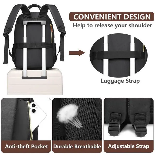 Convenient Luggage Strap & Anti-theft Design- The luggage strap on back of women bookbag allows it to fit on suitcase handle, freeing your hands on a business trip. Waterproof teacher backpack fits under the seat also meets airline carry-on requirements. Adjustable shoulder strap with mesh fabric for breath ability, it can distribute the weight of book bag decently on our back, providing you with more comfort during your trip