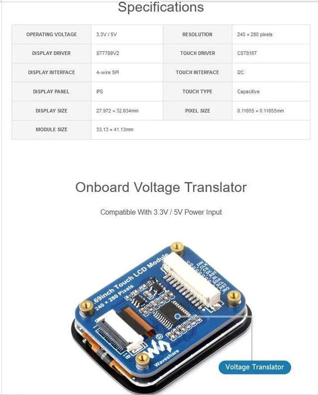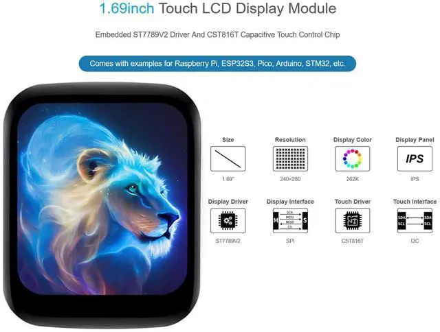 1.69inch Round LCD Display Module with Touch panel, Embedded ST7789V2 driver and CST816T capacitive touch control chip