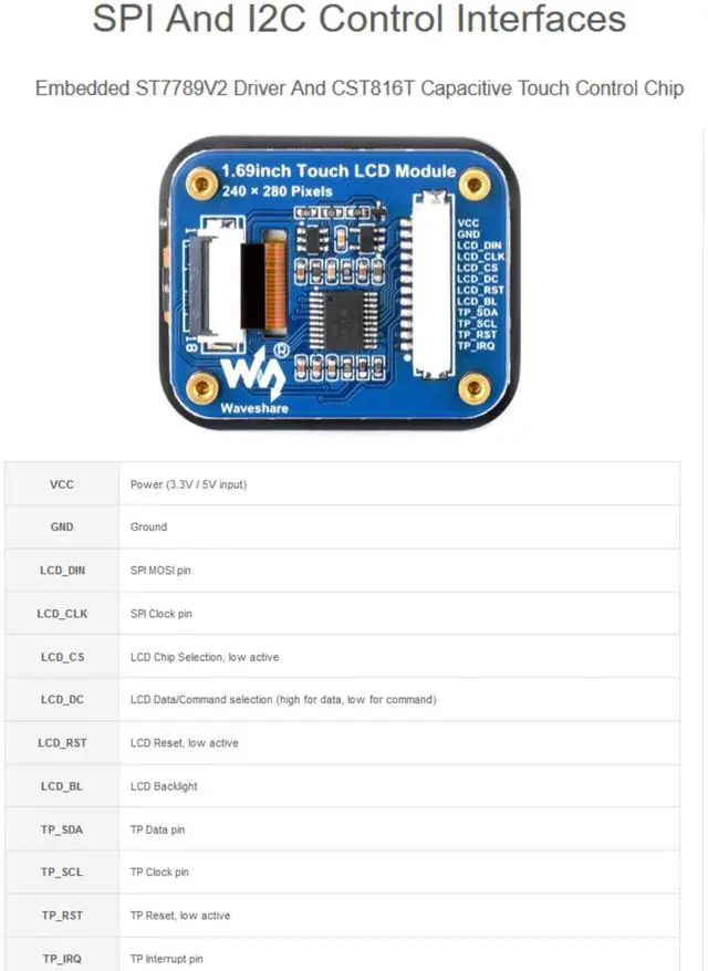 Embedded ST7789V2 driver chip and CST816T capacitive touch control chip, using SPI and I2C communication respectively, minimizes required IO pins