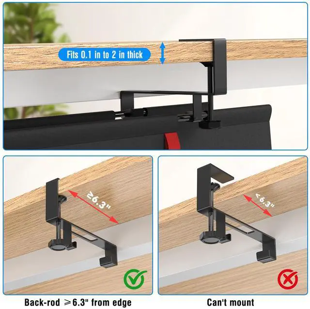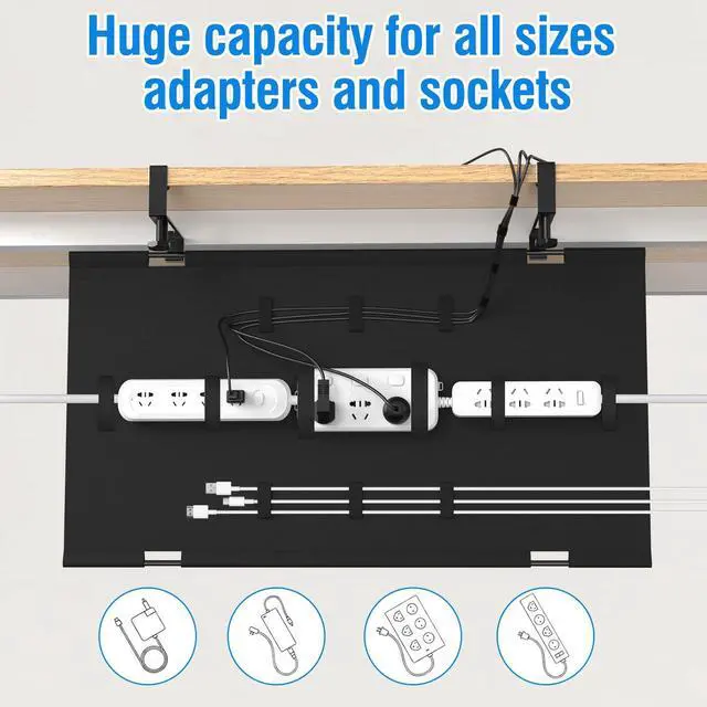 Large Capacity & Practical36 inch extra large desk cable trays fits all sizes of adapters and outlets, holds and hides everything under the table. Great idea for under table cable management. The under table cable organizer clips have built-in anti-scratch pads to protect the table, the cable basket fits desktop thickness from 0.1 inches to 2 inches.