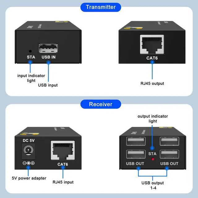 Plug & PlayEthernet to USB is easy to use and set up, transmitting signals over a single Ethernet cable for long distance. Works right out of the box with a single 5V DC power supply for the entire kit, simple and convenient to operate.