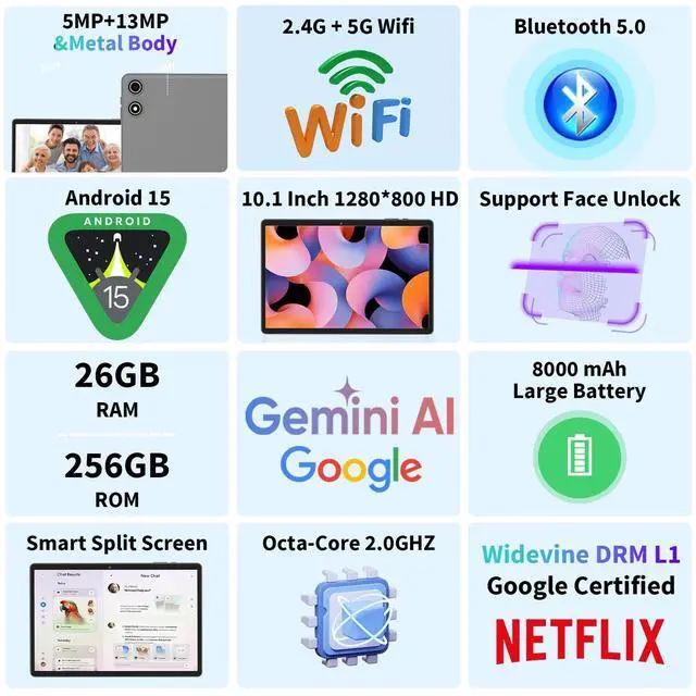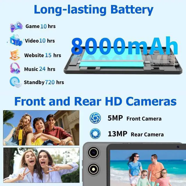 8000mAh Battery and 2.4G/5G WiFiThis 10 inch android tablet features an 8000mAh high-capacity battery designed for extended use.