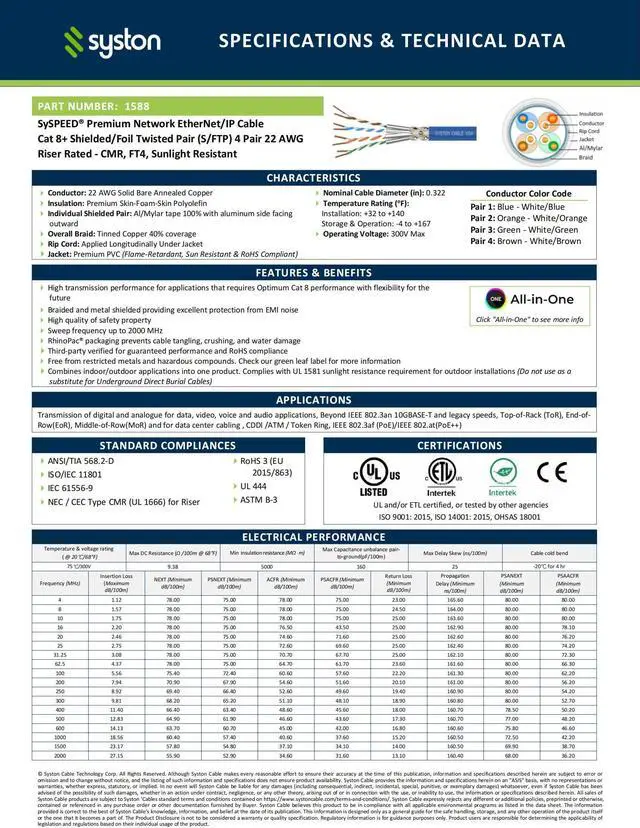 CMR (Riser-Rated) flame-retardant jacket, for peace of mind in case of fire. Operates in a wide range of temperatures, so it can be installed in any area in any part of North America.