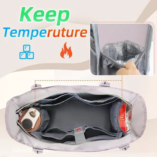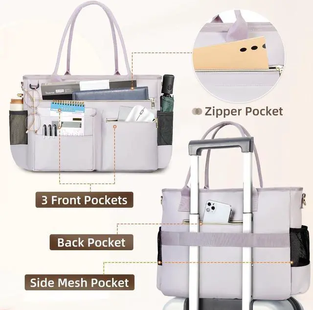 User-friendly Design:The work tote bags for women features four metal feet on the bottom to prevent scratching. Additionally, it comes with two insulated pockets help keep food drinks' temperature ( hamburger, hot coffee or cold cola) when you busy. There is a storage ring in the front which can hold your eyeglasses or others.Luggage strap allows the laptop messenger bag to slide over the luggage tube, freeing up your hands.