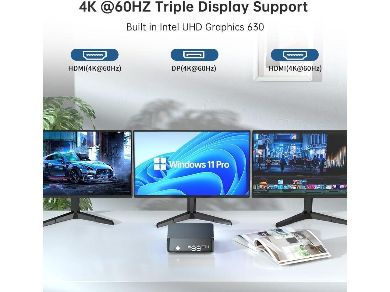 - Triple 4K@60Hz Display OutputExperience stunning visuals with this mini pc support for triple 4K display output via 2 x HDMI + DP ports. The UHD graphics processor delivers crisp and high-definition images. Whether in the office, training center, factory, or internet cafe, this mini PC is perfect for any computing needs. Features TPM2.0, automatic power-on, and network wakeup (BIOS