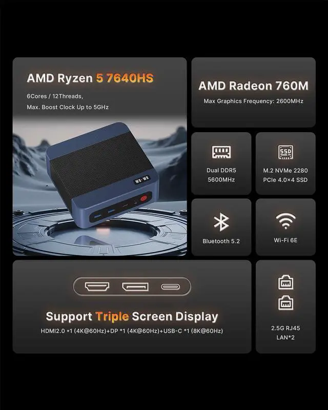 Ryzen 5 7640HS Processor & VESA MountGet serious performance with the AMD Ryzen 5 7640HS processor in the wo-we P8 mini gaming pc. With its cutting-edge Zen 4 architecture, this 6-core, 12-thread CPU boosts up to a blazing-fast 5.0GHz. It's incredibly efficient, delivering up to 49% more performance at the same power level, or using up to 62% less power for the same performance. The amd mini pc integrated AMD Radeon 760M graphics let you dive into AAA gaming, 4K editing, and heavy multitasking with ease. It's a true leap forward, P8 mini pc ryzen 5 outperforming the Ryzen 7 5700U by 44% and even beating the Ryzen 7 6800H by 30%.