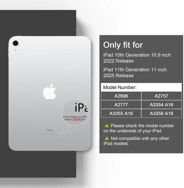 Specifically engineered for iPad (A16) 11th Generation 11-inch 2025 Release (Model:A3354, A3355, A3356), iPad 10th Generation 10.9-inch 2022 Release (Model: A2696 A2757 A2777). Not compatible with other iPad models