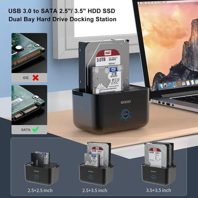 GODO Hard Drive Docking StationGODO 2 bay external hard drive docking station USB 3.0 supports all 2.5''/3.5'' SATA I/II/III HDDs/SSDs, support 2×18TB ,this sata hard drive dock compatible with Windows,Mac Os,Linux series