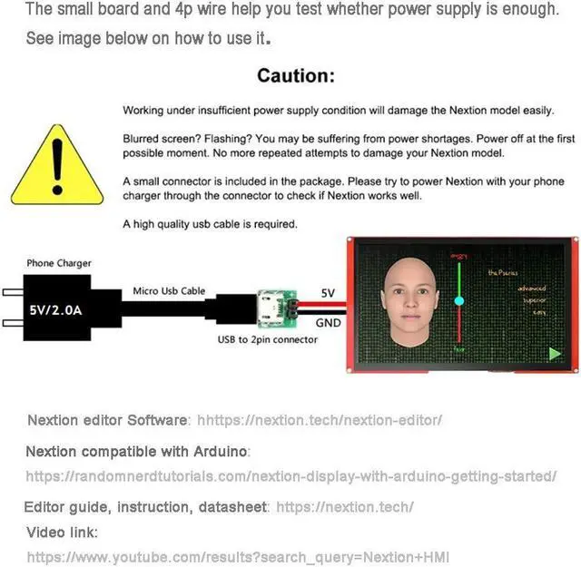 -To ensure Nextion 7.0 intelligent display work as expected, it's recommended to supply power via power adapter, not usb to ttl or boards.