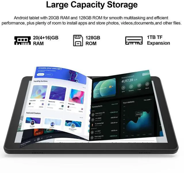 IPS Display & Dual Camera10.1 IN HD tablet equipped with high resolutionof 10.1-inch 1280*800 IPS display. Sizing up to 10.1 inches, you get more space, best choice for movie and video viewing and site browsing. In addition, there is a "reading mode" to reduce harmful light to the eyes so you get to enjoy a co