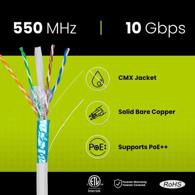 [High Performance Network Cable] Our outdoor cat 6 lan cable is 23 AWG with 4 pairs (8 conductors). The overall aluminum (AL) foil shield helps eliminate cross-talk and prevents electromagnetic interference (EMI). Suitable for 1 and 5 Gigabit speed up to 328 feet and 10 Gigabit speed up to 165ft depending on the installation environment. Bandwidth tested up to 550 MHz. Supports Power over Ethernet: PoE/PoE+/PoE++ (IEEE 802.3af/at/bt) 4PPoE up to 100W.