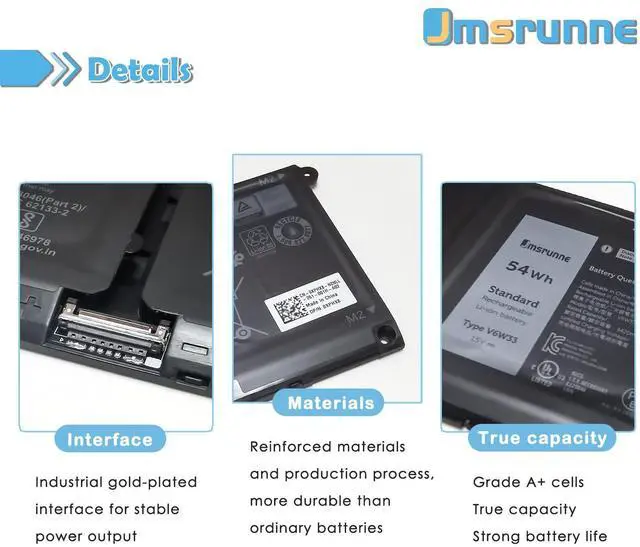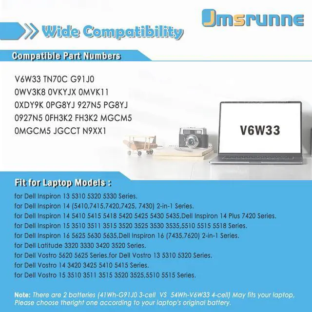 DELL V6W33 Specifications Model: V6W33 ./ Voltage: 15V ./ Capacity:54Wh /Battery type: Li-ion. /Battery life: Up to 1000 recharge cycles over the life of the battery. Also comes with installation tools. Purchasing Note: Due to the complexity of laptop battery models, you may not be able to accurately determine the model you need to purchase,Please open the back cover of the laptop to confirm the original battery model number