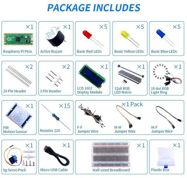 Starter kit includes commonly used sensors, for example: LED lights, 9g servo, LCD1602 display module, resisters and buzzer, PIR sensor.