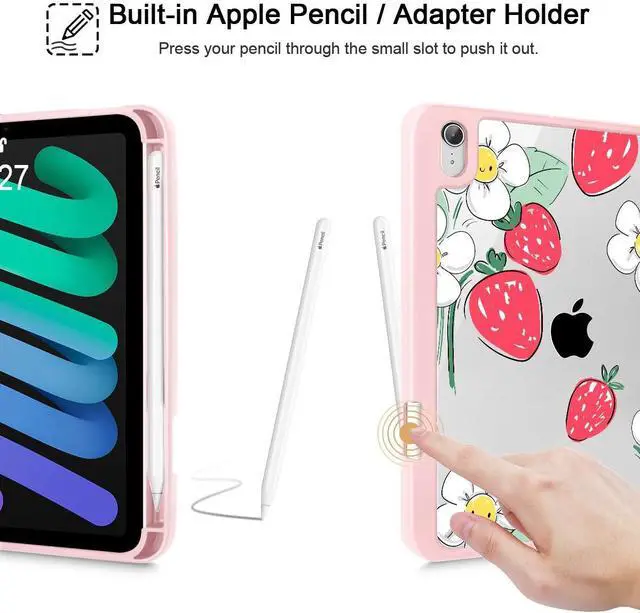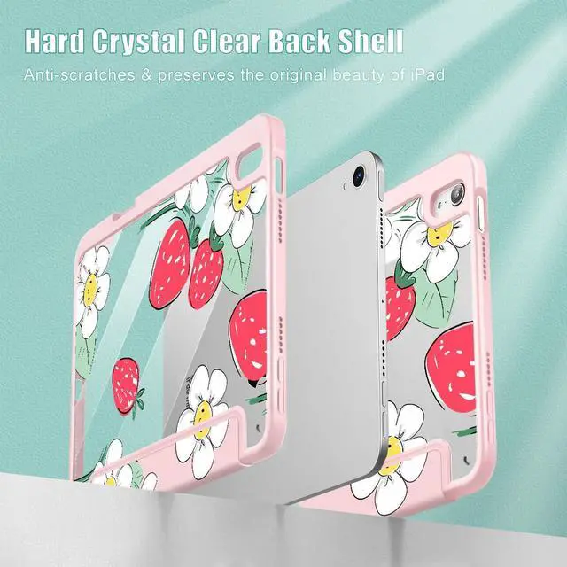 Mektron Printed Case for iPad mini 7 (A17 Pro) 2024/ Mini 6 2021, iPad mini 7th/6th Generation Case, Buit in Pencil Holder with Clear Back Shell + Trifold Stand + Auto Wake/Sleep, Strawberry Flowers