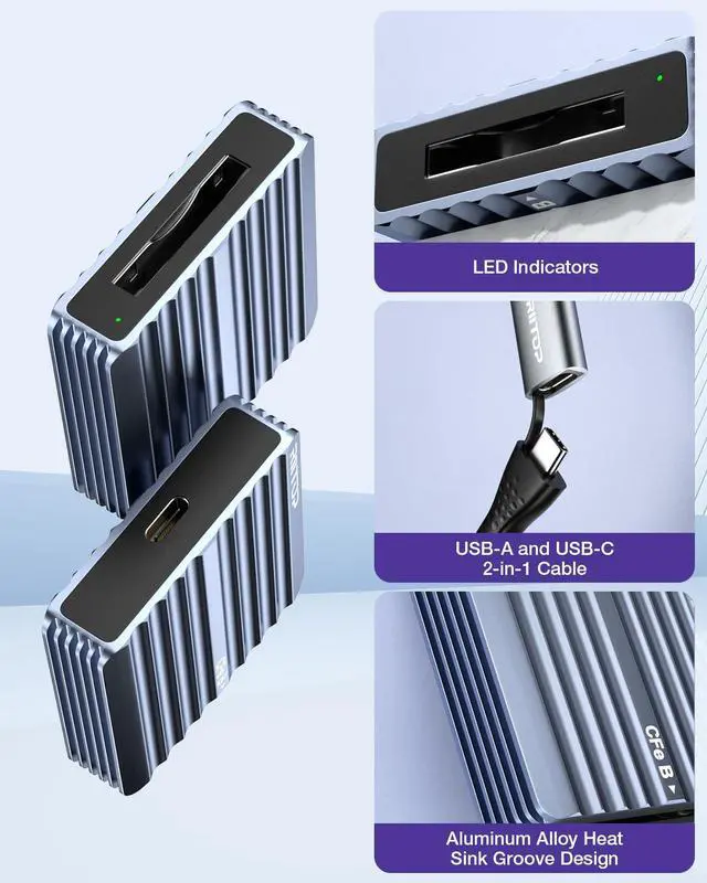 [Special Design] 1. It comes with 2-in-1 USB C Cable, you may take only this one cable to connect USB 3.0 A port or USB 3.1 Type-C (Thunderbolt 3/4 compatible) slot 2. The Aluminum Alloy Case and Heat Sink Groove Design will ensure the CFexpress Card Reader work stable even transfer large files 3. Designed with working LED Indicators