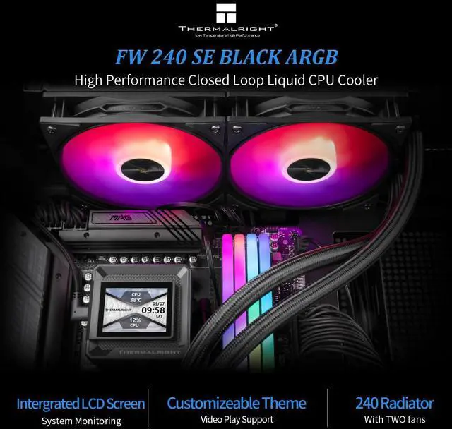 Thermalright FW 240 SE ARGB Black-AIO CPU Liquid Cooler,IPS LCD Screen with 320 * 240 Resolution,for AM4/AM5,Intel LGA1700/1851,2-inch Magnet-Absorbent LCD Screen for Images-Black,PC CPU Water Cooler