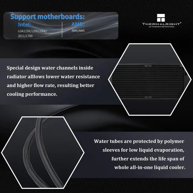 [Parameters of Water Cooling Radiator]The size of the water cooling radiator is 277x120x52mm, the cold head: 67x68x59mm, the speed of cpu fan is 2000RPM±10%, the voltage: DC 12V, the operating noise is29.8dBA, with the cooperation of the high speed of the water pump and the fan, it can ensure that the cooler cools the CPU for a long time and excellently.