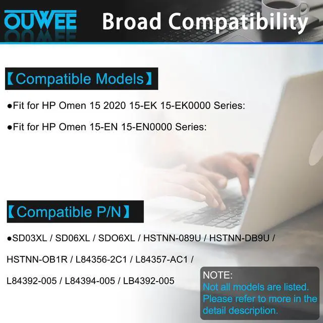 • Replacement Battery Part NumbersBattery for SD03XL / SD06XL / SDO6XL / HSTNN-089U / HSTNN-DB9U / HSTNN-OB1R / L84356-2C1 / L84357-AC1 / L84392-005 / L84394-005 / LB4392-005Purchase notice: The SD03XL (52.5Wh) and SD06XL (70.91Wh) batteries are mutually compatible. However, they are not compatible with the SD03XL (45Wh) battery. Before placing an order, please open the back cover of your laptop to confirm the battery model.