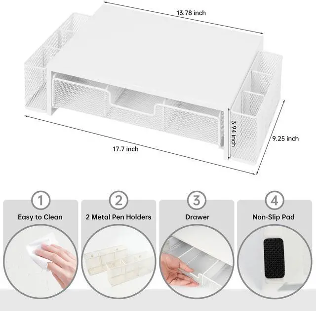 Keep your desk tidyThis computer stand instantly organizes your workspace with 2 pen holders and drawer, keeping your essentials neat and within reach. Just unbox itno tools needed! Enjoy a cleaner desk and boost productivity in seconds. No assembly. No hassle