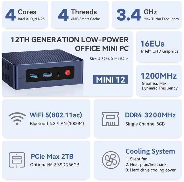 Intel N95 Low-Power Office Mini PCBeelink Mini S12 Mini PC adopts the 12th generation Intel AIder Lake-N95 (7nm) processor (4 cores 4 threads, 6M cache, up to 3.4GHz) Max 25W TDP,The performance is 20% faster than N5105. A fast, smooth and power-saving mini PC for daily productivity and entertainment needs,Host size: 4.52*4.01*1.54 inch Micro PC