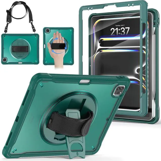 BRAECNstock case for iPad Air 13 Inch(M3/M2) 2025/2024 & Pro 12.9 inch 6th/5th/4th/3rd Generation 2022/2021/2020/2018 Cover with Screen Protector,Pencil Holder,360°Rotate Stand,Midnight Green