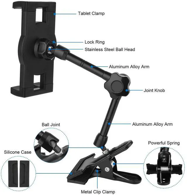 Multi-Angle Adjustable:Tablet mount arm has 2 ball joints,allowing to both of ball joints 90°tilt freedom by twisting joint knob, arm can be folded and stretched,also twisting joint knob to lock both of ball joints,stainless steel ball head of arm support tablet clamp 360°rotation freedom,easy for customer to adjust angle of tablet.