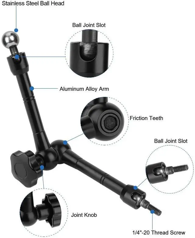 Articulating Magic Arm: Articulating magic arm length is 10 inch / 25.5cm,aluminum alloy and anti-rust stainless steel material.Sturdy,durable,corrosion-resistant and wear-resistant,maximum load capacity is 2.2 lbs / 1 kg.