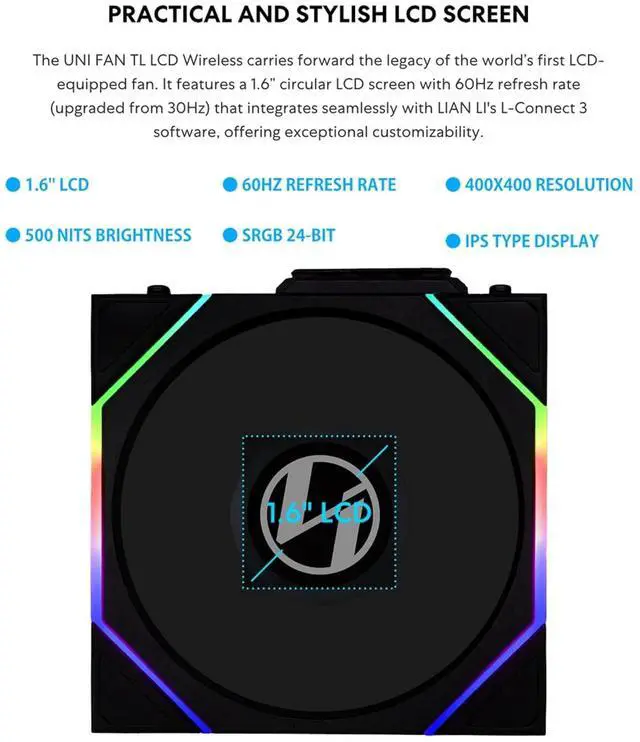 2.4 GHz Wireless Signal for RGB & Fan Control: Next-gen RGB connectivity for PC case fan managing the 1.6" LCD (LCD version) and RGB lighting with a wireless controller. Customize your systems style by uploading your own personalized MP4 / GIF / JPG / PNG.