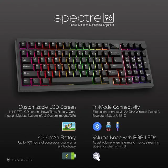 CUSTOMIZABLE LCD SCREEN: Personalize your gaming setup with the Spectre 96% mechanical keyboard with screen display; featuring a 1.14" TFT-LCD smart screen, easily upload your own GIFs for a dynamic display that sets your keyboard apart