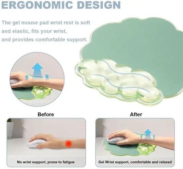 Green Mouse Pad: This cloud mouse pad uses gel filling design to provide comfortable support for your wrist. It can relieve wrist fatigue and pain, and help prevent carpal tunnel syndrome ^^