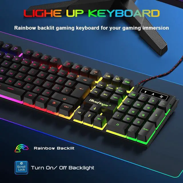 ^^ Backlit Gaming Keyboard: Rainbow backlit keyboard, you can easy turn ON/OFF by pressing Scroll Lock key, the Rainbow Backlight can illuminate the letters through the keys, which make it easier for You to type in a dark room. The double-shot injection moulding process ensures that letters never fade and have good light transmission.