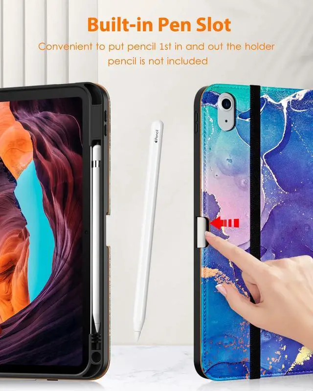 Number: A2757/A2777/A2696). Not compatible with any other model ^^ Built-in Pencil Holder - Securely carries and protects your pencil wherever you go. A hole has been designed at the back of the pencil holder that you can easily push pencil out without taking off your iPad 11/10 case ^^ Magnetic Smart Cover - Support Auto Wake/Sleep, built-in leather hand strap(one-handed operation) and external elastic band enhances magnetic closure ^^ Multi Function - Multiple horizontal bracket angles for comfortable watching movie or typing. Features front document card pocket to keep notes, cash, cards ^^ Premium Material - Exterior is made of premium synthetic leather, lined with microfiber provide full protection for your iPad 10th Generation, against impacts, drops and scratches