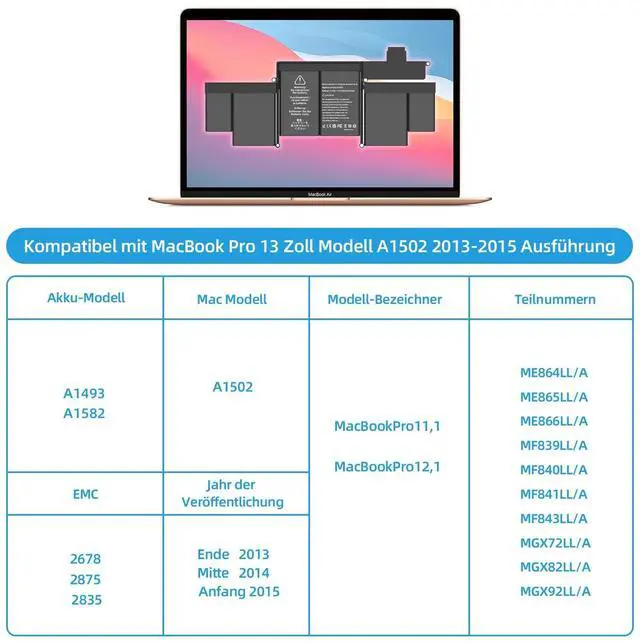 Suitable Mac Versions: Fit for MacBook Pro Retina 13-inch Model A1502 (Late 2013, Mid 2014, Early 2015);