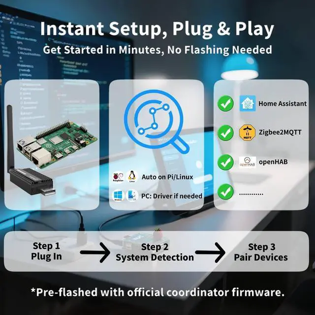 FLASHING REQUIRED: Skip complex configuration. This ZBDongle-E comes pre-flashed with official EZNet 6.10. 3 coordinator firmware, eliminating errors. It offers native plug-and-play recognition for Home Assistant (ZHA) & Zigbee2MQTT on Linux.