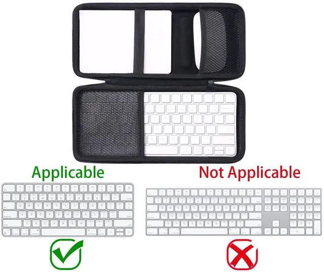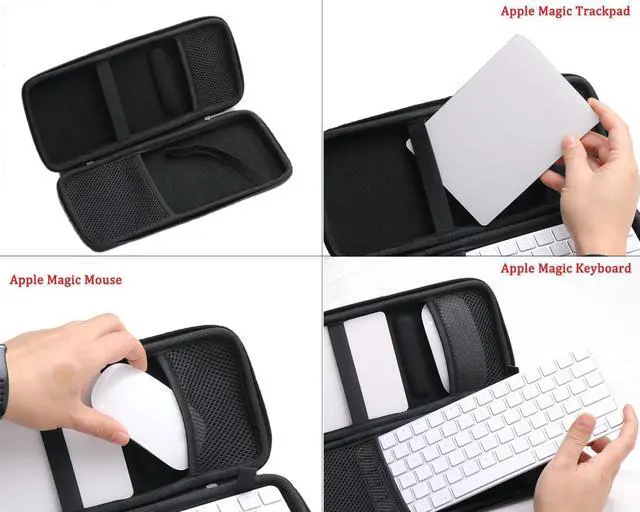The inDomit Hard shell EVA caseperfect fit Apple Magic Keyboard + Magic Trackpad + Apple Magic Mouse, Electronics Organizer ^^ Outer hard EVA material + outside Double stranded Oxford cloths + inside velvet fabric, cratch-resistant and wear-resistant, effectively protects your devices, shockproof dustproof and water resistance ^^ In the bottom room hold Apple Magic Keyboard,. In the top mesh pocket storage apple Magic Mouse, elastic band hold Magic Trackpad. Smooth and rigid 360-degree zipper is easy to open and close. Case with sturdy hand strap makes it easy to carry ^^ Portable body, easy to carry, suitable for traveling, going out, camping ^^