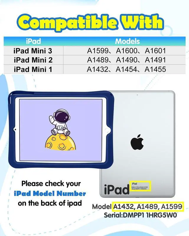 Please note: Not Compatible with any other device. You will receive with Mini iPad 1/2/3 case, a shoulder harness. ^^ Cute DesignThis for Apple iPad Mini 1/2/3 Cases case has cartoon and cute 3D astronauts blue design which makes your table case looks distinctive. This is a best choice for choice girls, boys. ^^ Rotating KickstandThe for iPad Mini 1st generation, iPad Mini 2nd generation, iPad Mini 3rd generation Case has 360rotating and 180folding handle kickstand that is rugged and stands firmly. You can get rid of your hands while watching movies or playing games. ^^ Shoulder StrapIf you purchase this for Apple mini ipad 1/2/3 case 7.9 inch, you will receive a complimentary cute shoulder strap, which is detachable and adjustable, making it easy for you to carry for ipad mini case 3/2/1 when you go out. ^^ Material QualityThis for ipad mini 7.9 inch case cover is made of high-quality and durable soft silicone, which has a good touch and can also protect your flat shell from falling, shock, and dust.