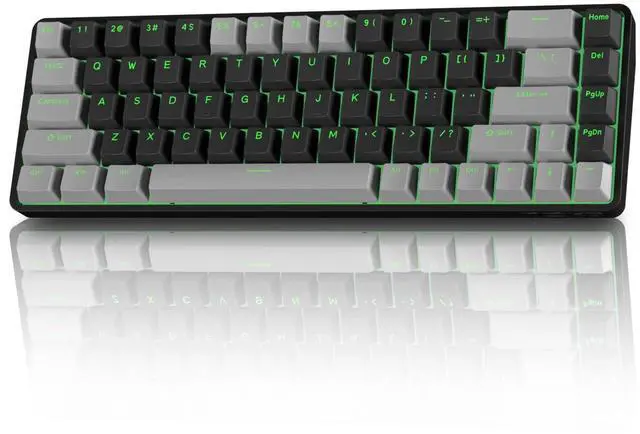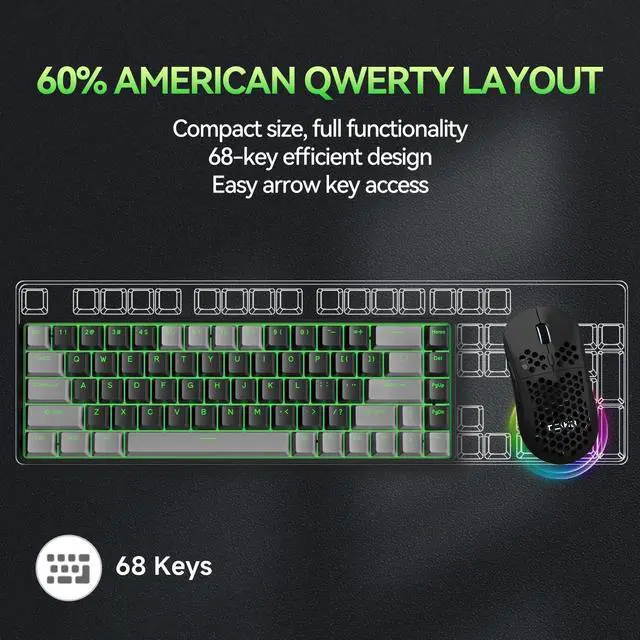 3-Mode Connectivity & Long Battery LifeTMKB T68 supports wired (Type-C), 2.4G wireless, and Bluetooth 5.0 connections. Its 3000mAh battery offers up to 12 hours with RGB on or 333 hours without backlight. Auto-sleep mode activates after 3 minutes of inactivity. ^^ Compact 65% LayoutRetains arrow keys in a compact form, saving desk space. Ideal for gaming and office use, and easily portable. ^^ Tactile Blue SwitchesMechanical blue switches provide clear tactile feedback and audible clicks. Pre-lubricated, with 60gf actuation, 2.3 mm travel, and 50-million keystroke lifespan.